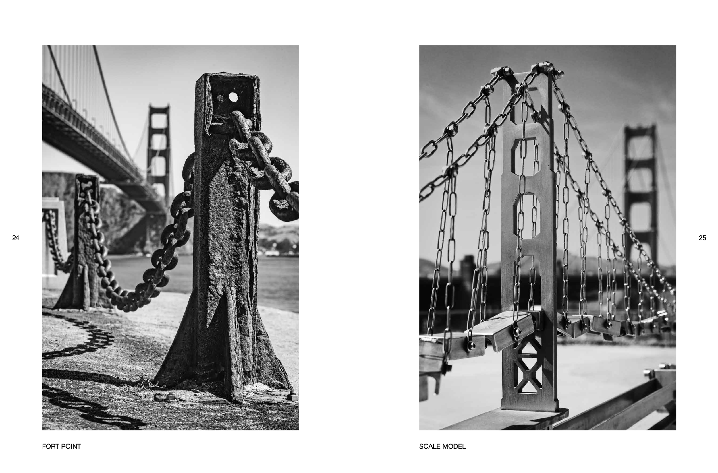 Going into the editing process, I knew right off that I wanted to show the bridge, as Hokusai did with Mt. Fuji, from different perspectives, in different seasons, and in all kinds of weather. This didn't mean I followed Hokusai slavishly, but I was certainly mindful of what he did. It wasn't enough to select thirty-six "greatest hits" and be done with it. Each image had to work on its own and also work with the image before it and after it to advance the visual narrative. I bookended the sequence with two photographs of the bridge in fog, which gave a sense of coming full circle. Within that, I endeavoured to create visual connections between images. For example, I placed an image of old rusty chains at Fort Point, echoing the suspension cables of the bridge, beside an image of a scale model of the bridge. In doing so, it feels like the chains in the scale model pick up where the rusty chains leave off. These two distinctly different images make a wonderful, unexpected connection. As much as possible, that's the kind of thing I was looking to do in the editing process.