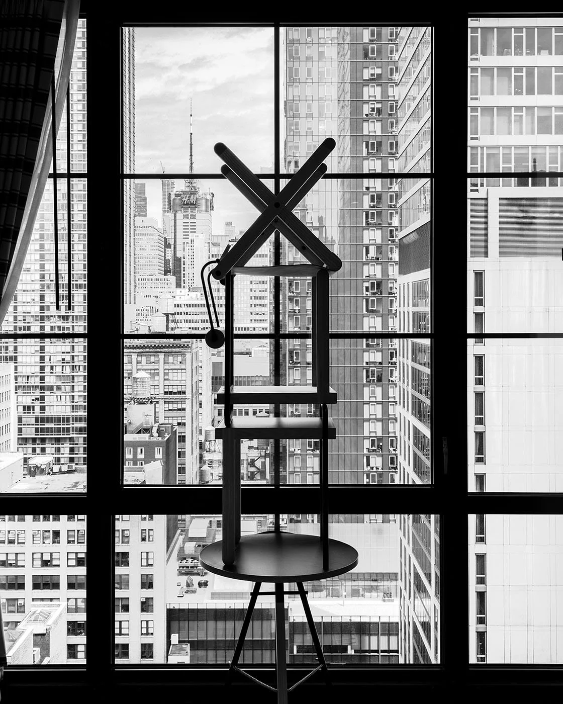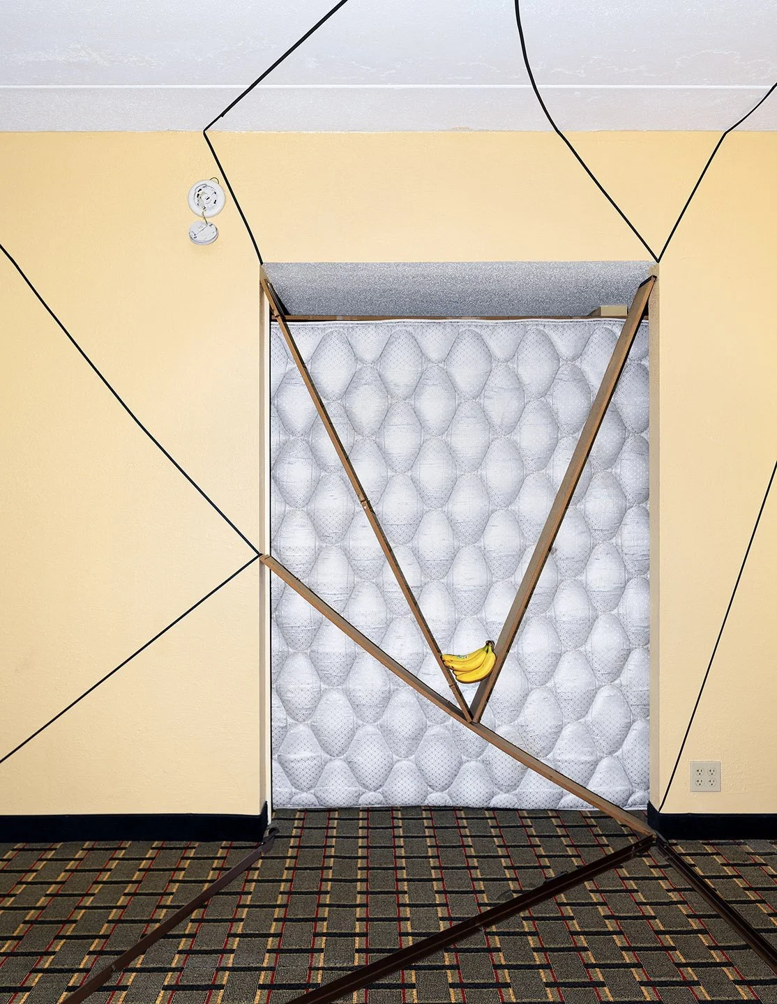 Using only the objects found in each hotel room, he works alone and in secret, stacking, leaning, and balancing furniture into surreal configurations that feel suspended in defiance of gravity, visual gestures that unlock dormant emotions and questions about displacement and anonymity. The final photographs, reminiscent of crime scene documentation, become the only record of each intervention. Once the image is made, every trace of the event is erased.