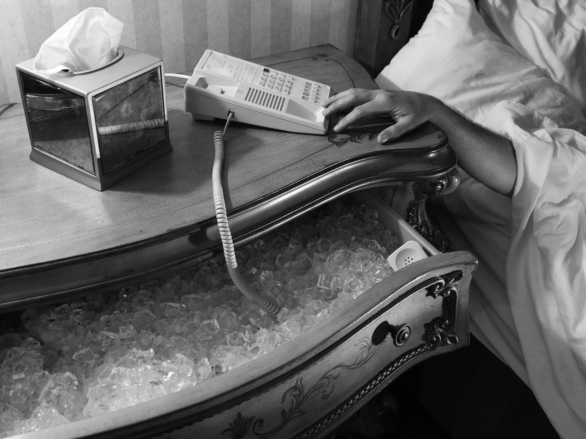 I think that's one of the reasons why these spaces have such a wide range of uses. People go there to have love affairs, engage in criminal activities, escape from the law, or celebrate weddings. A hotel is such a weird, interesting place because it exists at this crossroads and is so good at keeping its secrets. We feel that when we go there, we have a degree of anonymity, that anything we do will be cleaned up after us and the next person will never know. I want the work to function within those parameters.