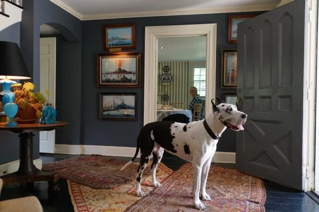 In this one we have the dog in the frame with the owner in the background. Normally I would want that frame clear. This was for Tommy Hilfiger, and they wanted to see an empty room so they could say, "We like the room." But the dog came in at the right moment, with the owner looking the other way. Suddenly there's a moment, and their story has become my story. I would snap it, put it on RAW, archive it, and it wound up being in my book.