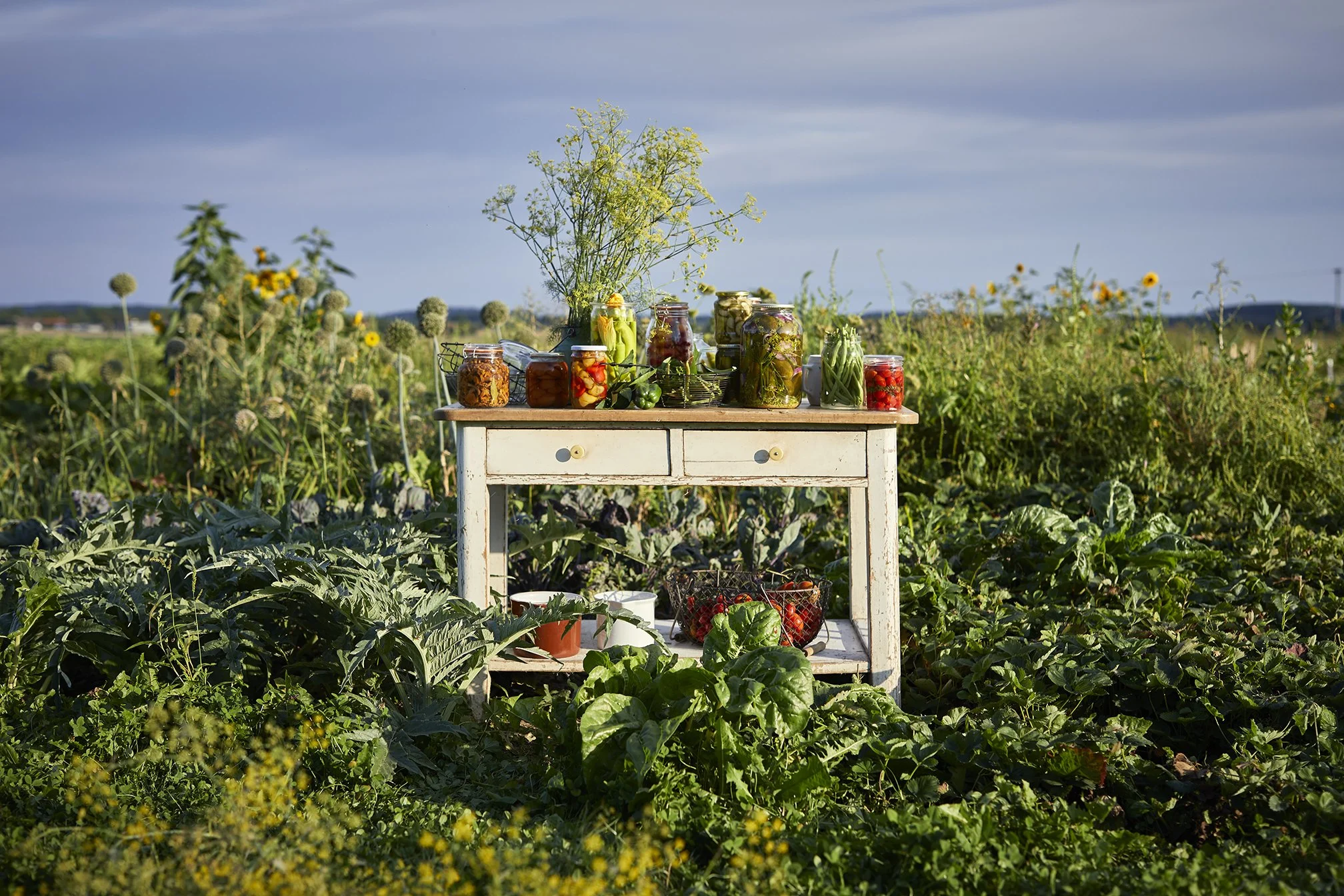 This is the path I've been on my entire career. Food is my main topic, but it interests me in its entirety-not just as a finished dish, but as a process. From the farm, field, or garden bed, through the pantry and fridge, to the final composition on the plate. I like the combination of documentary and stylization, and I try to project both into my work. I'm interested in who is behind the food-farmers, breeders, chefs. The people who grow and prepare it. With preserving, this approach made even more sense to me. I didn't want to just shoot recipes. I wanted to capture the journey-the journey of the ingredients, the journey of the people, the work, and the time hidden inside every jar. To me, it's natural. I can't imagine the book being built solely on finished dishes without context.