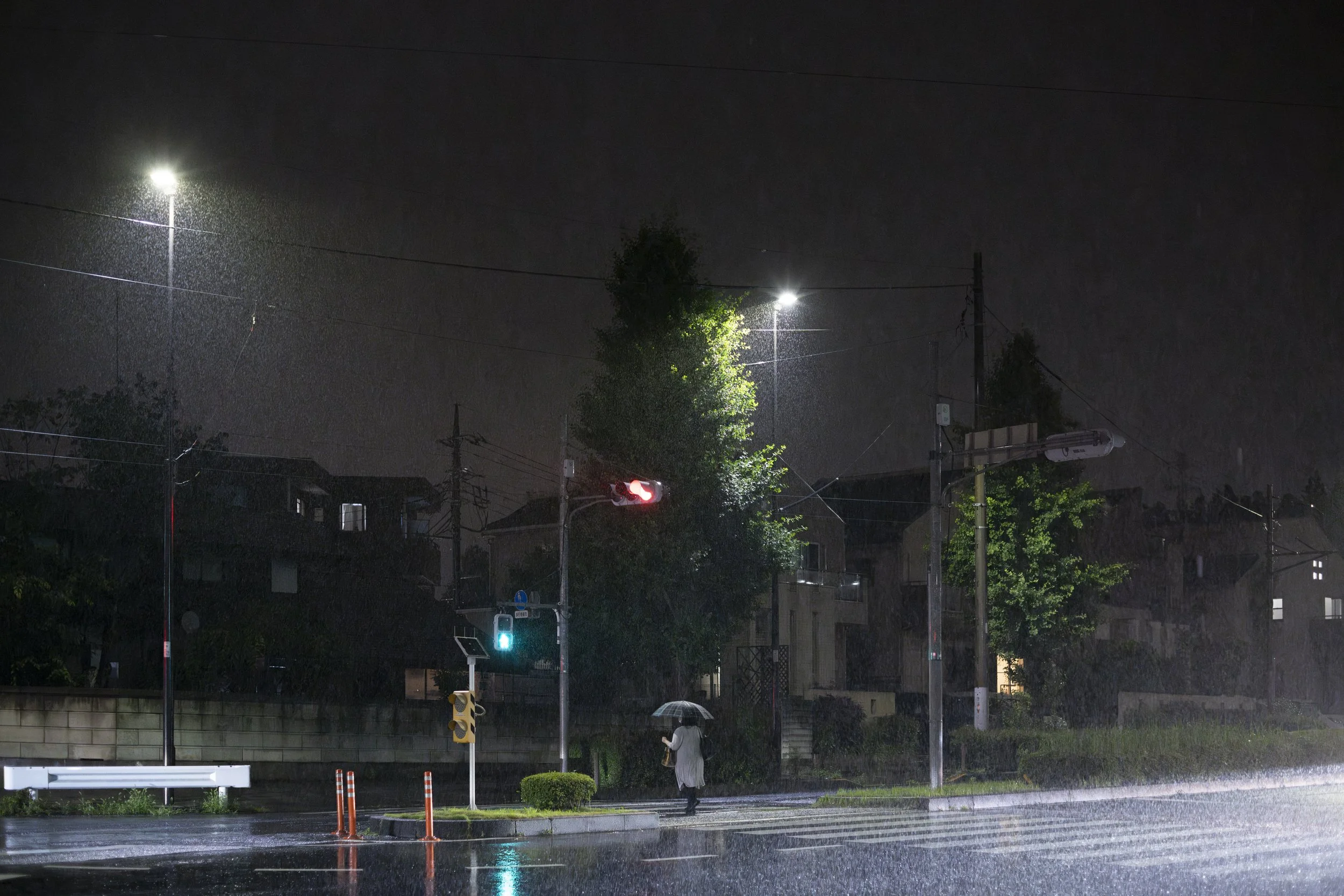 The shooting process also mirrors game exploration: Tama New Town is vast yet bounded, like a map. I move through it at night, and when I find an intersection with the right potential, I set up the tripod and wait.