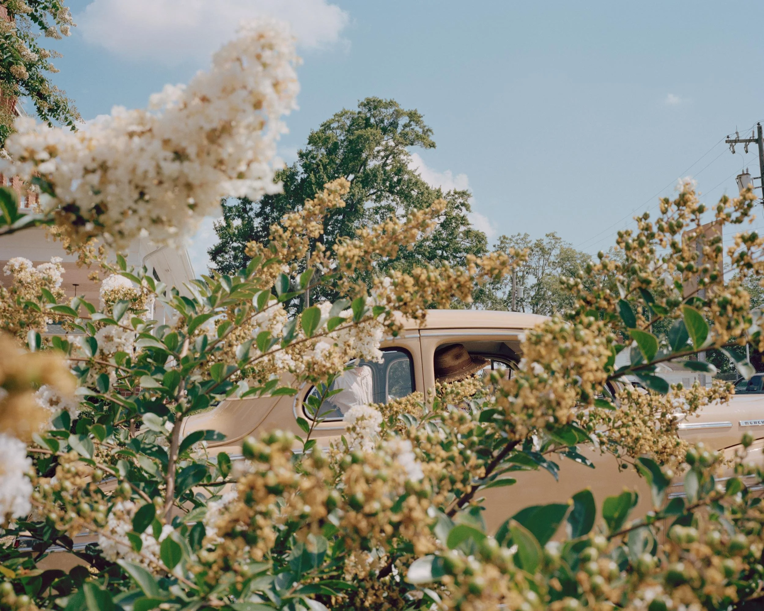 But there was one frame that wasn't part of his main plan. He had a smaller camera on his shoulder, a Mamiya 6x7, just to grab other moments. Before the reenactment started, he saw the couple dressed in period clothing getting into an old car. They would drive this car during the performance.