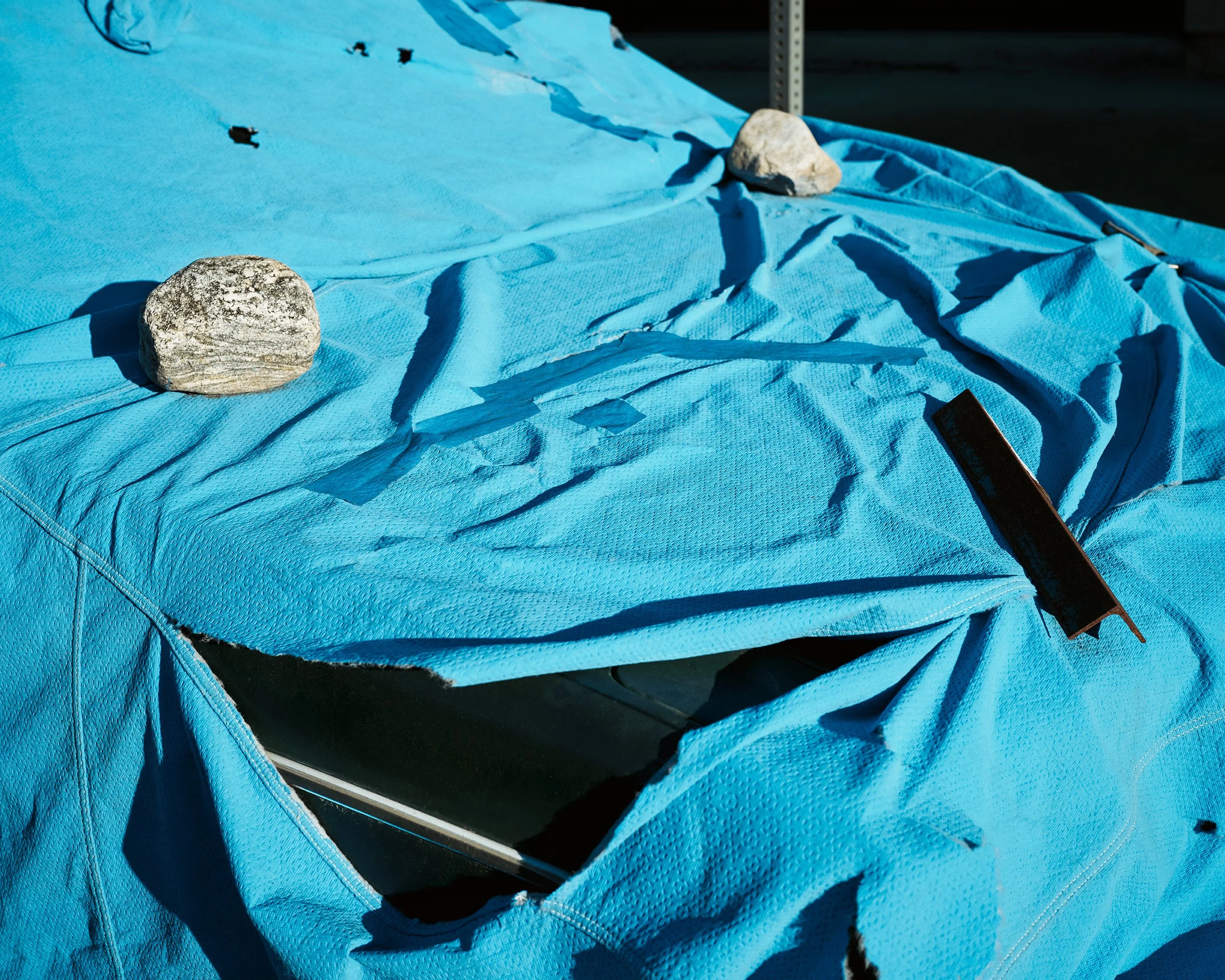 Yes. There are multiple photographs in the final edit that I made different versions of with varying amounts of time in between, sometimes days or weeks and sometimes months or years. The impermanence of everything was a very consistent theme in the photography. For example, the car with the torn blue cover (Farley, 2023) was permanently parked on my block, and I took pictures of its devolution over the years. The car’s owner is, to put it politely, a committed collector of discarded objects and pretty notorious around the neighbourhood. His property is in a constant state of chaos. Sometimes he would change out the items that held the cover down. The tears in the cover would move and grow to the point where it became comical how little of the car the cover was actually covering. So when I saw that “face” smiling at me, I was confident that was a picture worth taking. I also knew the car would probably look different the next time I saw it, so if something interested me, I didn’t second-guess or overthink it. I would just take the picture.