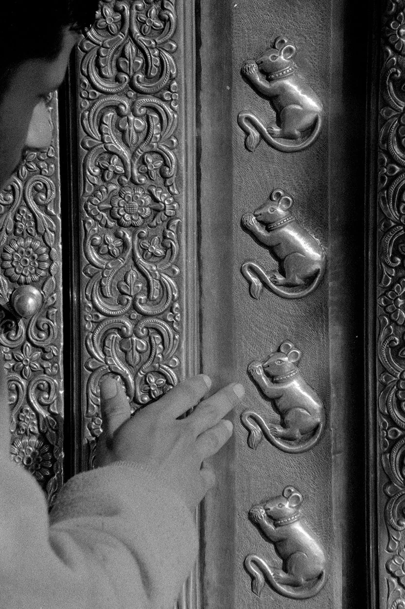 Outside the temple, tourists will make excuses to stay in the tour bus; for those who go inside, it is a carnival, an oddity, something to tell their friends about that they braved the rats. As I'm photographing, the rats crawl on me, nibble my socks, run up my leg as I go down on one knee to make a more detailed shot of a group of them huddling together in the cool shade. They are soft and friendly; my only fear was if I accidentally stepped on or crushed one. Any murdered rats are to be replaced by solid gold, in the same size, shape, and weight as your victim - but it wasn't just the possibility of having to pay; I obviously more directly wanted to avoid doing harm of any kind.